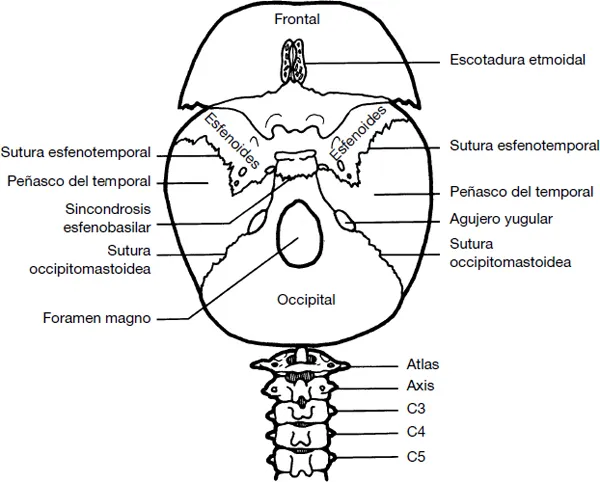 He llegado a considerar que los nervios craneales se parecen a los nervios espinales o raquídeos en su disposición de entrada y salida del tronco cerebral. Su parecido es evidente si vemos la médula espinal como una extensión caudal del tronco cerebral. Por lo general, se puede pensar en «segmentos del tronco cerebral» con los nervios craneales como raíces segmentarias de los nervios. Así se organiza de modo conveniente lo que a simple vista parece ser un sistema muy complejo (ILUSTRACIÓN 1.1). Para seguir con esta analogía, puedes concebir los agujeros yugulares como agujeros intervertebrales entre el occipital y los temporales. Estos agujeros permiten el paso de los nervios craneales IX, X y XI justo cuando las raíces de los nervios espinales atraviesan por debajo los agujeros intervertebrales (ILUSTRACIÓN 1.2). Cuando hablemos de la anatomía funcional y disfuncional de los distintos nervios craneales, resultará evidente la utilidad de este modelo.