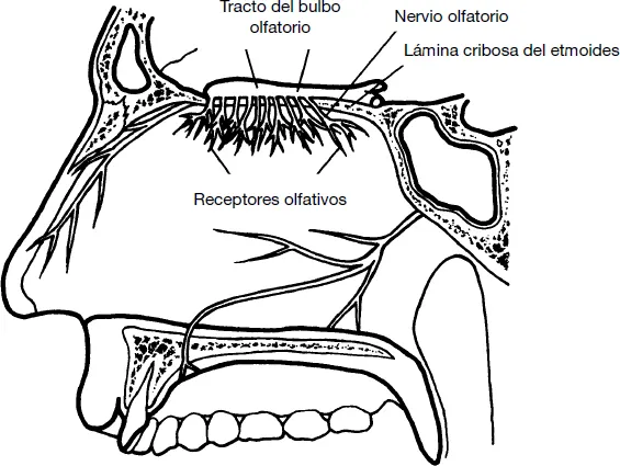 ¿Qué sentido tiene toda esta anatomía? Cuando un olor (compuesto de diminutas partículas químicas, moléculas e iones) llega al techo de las fosas nasales, los receptores sensoriales de la mucosa nasal convierten la estimulación química en impulsos nerviosos. Para que los receptores sensoriales respondan al olor, la sustancia química debe disolverse en el líquido que segregan las mucosas. Si las partículas no entran a formar parte de la solución, los receptores no se activan. Una causa habitual de cierta pérdida de la agudeza del olfato es la sequedad nasal. Tal vez hayas notado cierta pérdida del olfato cuando el clima es muy seco o cuando utilizas agentes medicinales que sequen las mucosas nasales. Por supuesto, la nariz también debe estar despejada para que las partículas odoríferas lleguen a las fosas nasales superiores. Cuando se tiene un resfriado fuerte con rinitis (nariz moqueante) e hinchazón de los cornetes nasales, el acceso a las áreas sensoriales queda limitado y también se reduce el sentido del olfato.