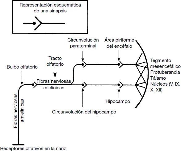 Después de entrar en la sustancia del encéfalo por los bulbos olfatorios, estas fibras sensoriales forman su primera sinapsis. Las fibras amielínicas, que han ascendido desde las mucosas de las fosas nasales, establecen sinapsis con las fibras mielínicas del tracto olfatorio de los lóbulos frontales del encéfalo. Estos tractos olfatorios viajan a continuación en sentido posterior por la sustancia del encéfalo hasta las circunvoluciones paraterminal y del hipocampo. Aquí se produce otra unión sináptica con fibras que van a las áreas piriforme y del hipocampo del encéfalo. Estas conexiones se establecen a través de las estrías olfatorias lateral y medial.