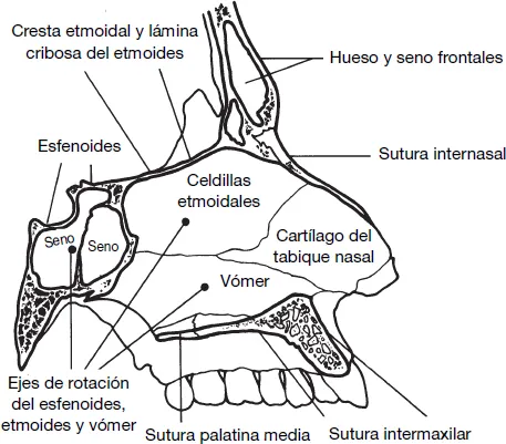El etmoides es muy vulnerable a sufrir disfunción secundaria a problemas con el frontal, vómer o esfenoides (ILUSTRACIÓN 1.6).