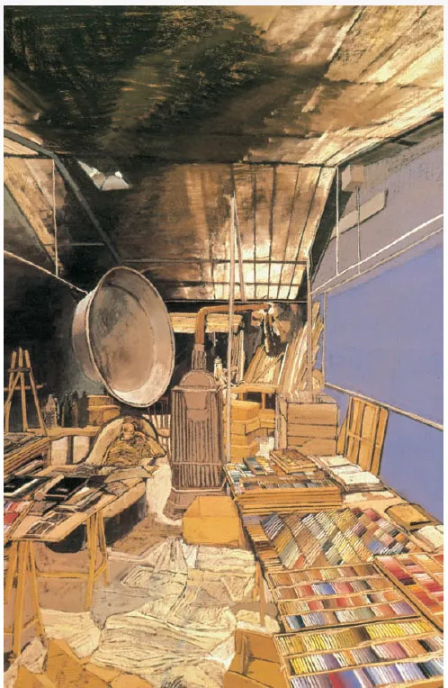 Sam Szafran, Taller. Colección particular. Cada artista tiene sus preferencias y desarrolla su obra utilizando unos medios en detrimento de otros; como por ejemplo las cretas y el pastel, en el caso del pintor que realizó esta magnífica obra. Para decidir cuáles son los medios que más nos convienen, primero hay que conocer todas las posibilidades y experimentar con todo tipo de utensilios.