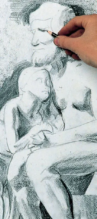 Del grafito y no sólo del lápiz. Porque, como ya sabemos, el grafito se presenta en distintos formatos: en barras, en minas y, por supuesto, también en lápices convencionales. Las calidades del grafito se pueden resumir en los siguientes factores: suavidad en los degradados, de oscuro a claro o viceversa, mediante la combinación de minas de distinta dureza; zonas de intensidad uniforme, sin rastros de trazos, conseguidas con frotados con la mina plana; perfiles muy bien delimitados dibujando con el lápiz de punta (con la mina bien afilada). En resumen, que dibujando con grafito, el juego de luces y sombras puede explotarse al máximo, consiguiendo también una excelente definición de contornos, perfiles y pequeños detalles. En la gran imagen que preside estas dos páginas, llamamos su atención respecto algunos fragmentos significativos, convenientemente ampliados y explicados en sus particularidades técnicas. Vale la pena que ensaye estas soluciones en un papel, mientras estudia los efectos conseguidos en el dibujo de la ilustración.
