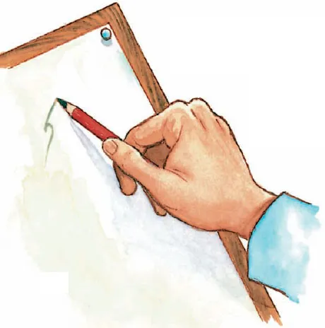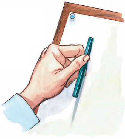 La ilustración al pie de estas líneas muestra la manera de sostener el lápiz cuando hay que sombrear con toda la extensión de la mina (sombreado sin trazos visibles). Esta posición sirve también para trazar rectas con facilidad, moviendo el lápiz en la misma dirección marcada por la mina.
