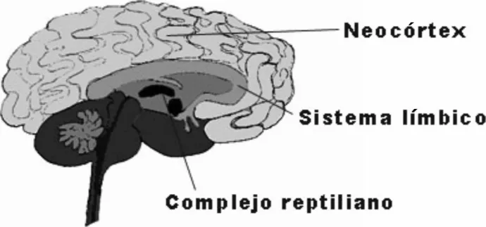 Primeramente tendríamos el “complejo reptiliano”, que se denomina así por ser el propio de la Edad de los Reptiles, el cerebro más primitivo y más básico que está compuesto por el tallo encefálico y el sistema olfativo, y en él se generan las funciones vitales más primarias tales como los movimientos automáticos, la respiración y las reacciones metabólicas. Podríamos decir que éste es el cerebro más instintivo, más animal, menos humano.