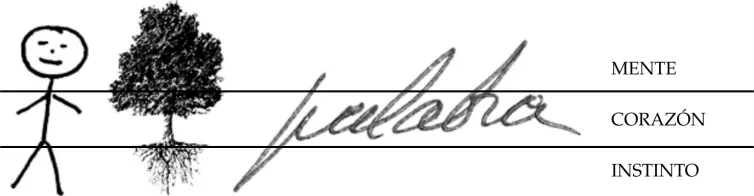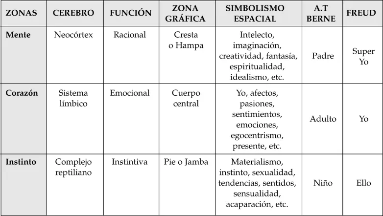 – La mente, el cerebro racional (neocórtex), es la cabeza, la copa del árbol, la cresta o hampa en el gesto gráfico, donde se encuentran representadas las ideas, los pensamientos, la imaginación, la fantasía; en definitiva, el intelecto y también la espiritualidad.