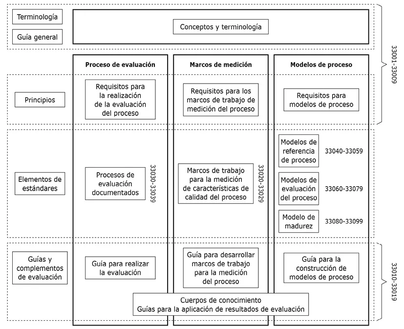 • Guía general: un documento que proporciona una guía general para toda la colección y la estructura de la familia ISO/IEC 33000.