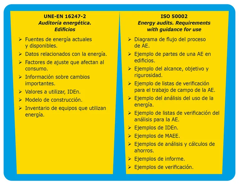 • UNE-EN 16247-2:2014, UNE-EN 16247-3:2014 y UNE-EN 16247-4:2014 aportan los requisitos específicos de aplicación a los sectores de edificios, procesos industriales y transporte, respectivamente. Estos tres ámbitos requieren consideraciones específicas para una correcta estimación del consumo energético. Estas partes específicas han de utilizarse conjuntamente con la UNE-EN 16247-1.
