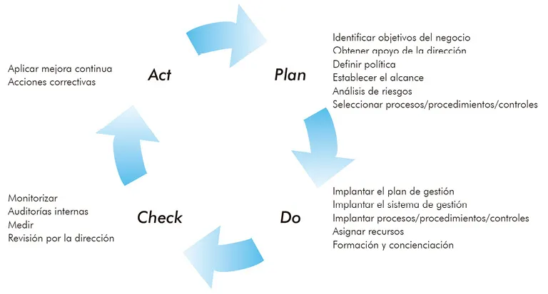 Una novedad con respecto a anteriores versiones de la norma es la desaparición del ciclo PDCA como marco obligatorio para la gestión de mejora continua, indicando únicamente en su apartado 10.2 que “la organización debe mejorar de manera continua la idoneidad, adecuación y eficacia del sistema de gestión de la seguridad de la información”.