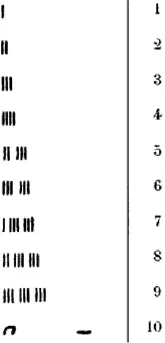 El procedimiento que hemos descrito no es nuevo, sino que pertenece a nuestra herencia cultural. La actividad de concatenación simbólica puede rastrearse en las representaciones numéricas utilizadas por los fenicios hacia el 3000 a. C. La figura 2.3 muestra cómo los primeros diez números naturales eran concebidos como concatenaciones de un signo-unidad, a saber, una barra.