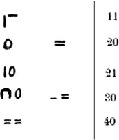 Lo que resulta relevante es que el procedimiento de concatenación de unidades-barras se extiende a la concatenación de los nuevos signos de forma de representar nuevos números naturales. Así, por ejemplo, como se puede apreciar en la figura 2.4, el número 20 se representa de dos formas diferentes: la primera, poniendo dos signos tipo semicircunferencia que representan el 10, de manera que se obtiene una especie de circunferencia, o simplemente poniendo una barra horizontal arriba de otra. Similarmente con el número 30: tres barras horizontales, o tres semicircunferencias (dos de las cuales forman una circunferencia). El número 40 se representaba por medio de cuatro barras horizontales.
