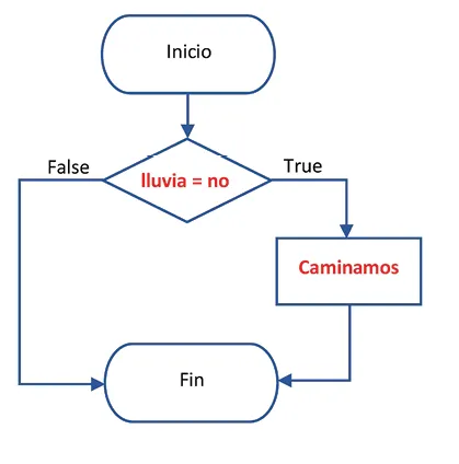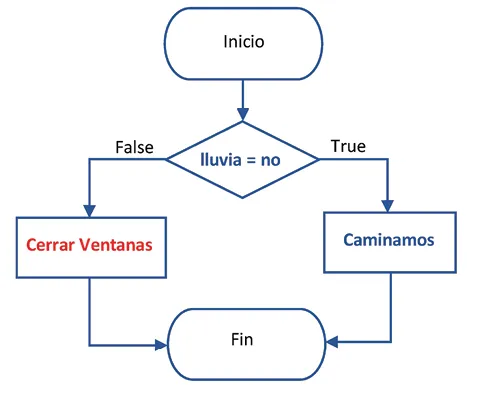 Siguiendo la estructura anterior, si intentamos llevar el ejemplo en el que comprobamos si llueve, podríamos decir que para realizar la comprobación lo haríamos indicando que no llueve (lluvia = no).