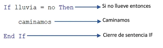 La sentencia If podemos traducirla directamente del idioma inglés. Es por ello que se utiliza de la forma que hablaríamos, por ejemplo, “si no llueve entonces caminamos”. Esta expresión llevada a lenguaje de programación, podríamos decir que sería: