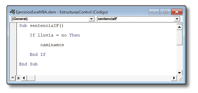 Una vez vistos los pasos y plasmados en el flujograma, creamos el correspondiente código VBA. En el siguiente ejemplo vemos la sentencia If y cómo aplicar el flujo anterior sobre una condición en código.