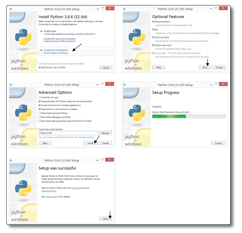 Haremos clic sobre el elemento indicado con una flecha en la imagen superior, tras lo cual se procederá a la descarga de python-3.6.6.exe, un fichero que también encontraremos en el material descargable del libro. Lo ejecutamos y comenzará un asistente de instalación donde pulsaremos los botones de los cuadros de diálogo que se indican con flechas tras rellenar las opciones que se muestran si fuese necesario: