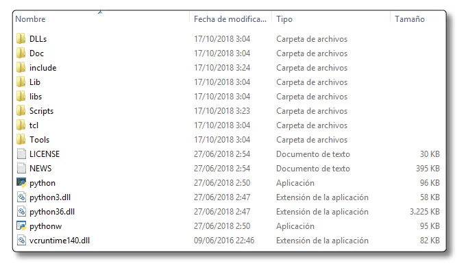 Si todo ha salido bien tendremos el siguiente contenido dentro de C:\Python36: