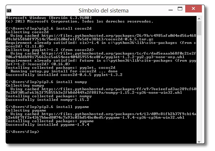 Como hemos añadido Python 3.6 al PATH del sistema podremos ejecutar sus elementos desde cualquier carpeta. Abriremos una ventana de comandos e introduciremos uno a uno los tres siguientes: