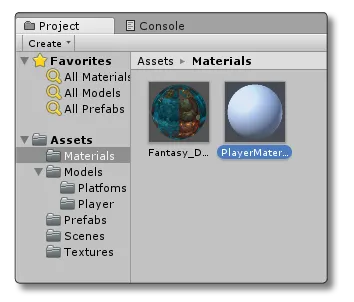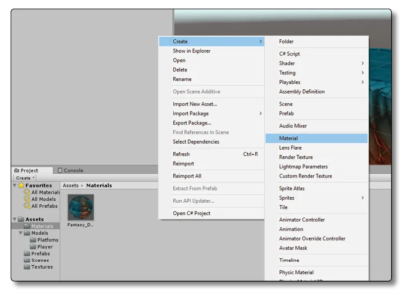 4. Vaya al folder de “Materials”, haga un nuevo material (con clic derecho “new material” y renómbrelo como “PlayerMaterial”.