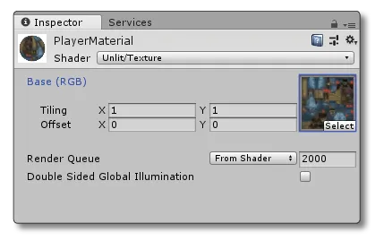 5. Seleccione el material “PlayerMaterial” y en la ventana de “Inspector” asigne los siguientes valores para aplicar el mapa de textura al material y que sea de tipo “Unlit”.