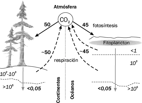 Flujos de carbono orgánico en sistemas continentales y oceánicos —expresado en gigatoneladas de carbono por año (Gtn/a), 1 Gtn equivale a 109 toneladas— y tiempo de residencia del carbono en los diferentes compartimentos —expresado en años—. Las plantas terrestres y el fitoplancton marino captan CO2 durante el proceso de fotosíntesis (flechas continuas) dando lugar a la producción de carbono orgánico o biomasa. La mayor parte del carbono orgánico retorna a la atmósfera en forma de CO2 como resultado de los procesos de respiración (flechas discontinuas). En el océano, parte del carbono orgánico se hunde hacia el océano profundo, donde queda retenido durante cientos de años, el tiempo que tardan las corrientes profundas en volver a aflorar en superficie. Se estima que la exportación de carbono orgánico hacia el océano profundo, la conocida como bomba biológica, es del orden de 5-11 Gtn/a, de las cuales menos de 0,05 Gtn acaban incorporándose a los sedimentos. En escalas de tiempo geológico, parte del carbono orgánico se acumula en el subsuelo y los sedimentos y se transforma en carbón y petróleo, respectivamente (flechas grises). La mayor parte de los flujos de carbono orgánico hacia el océano profundo están relacionados con el hundimiento de proliferaciones de diatomeas.