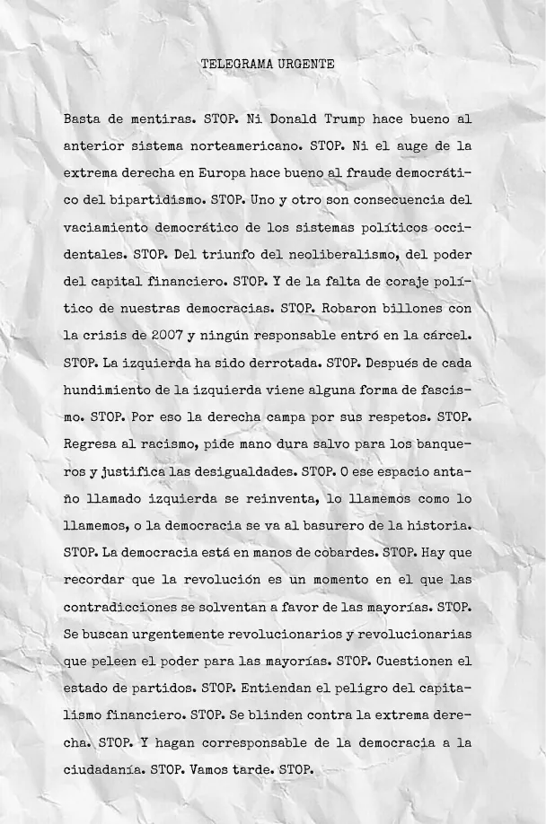 Siempre te construyen tus enemigos. La izquierda ha perdido de vista a los suyos. Digo “la izquierda”, pero en realidad estoy queriendo decir ese lugar antaño llamado izquierda. El mundo ha cogido una velocidad de vértigo y la izquierda arrastra aún, en el siglo XXI, la cojera de la Unión Soviética. Cada año que pasa, la izquierda —ese espacio antaño llamado izquierda— parece quedarse más y más atrás en la carrera de las soluciones y las propuestas. Apenas estaba empezando a entender Facebook y Twitter y aparecen las block-chains (las cadenas de bloques que permiten las criptomonedas) o el big data (la obtención y gestión de grandes cantidades de datos), que vuelven a dar herramientas a los poderosos, sean mafiosos de traje o tatuaje, financieros que acarician gatos y estrellas Michelin o mercenarios tradicionales con fusil, dron o algoritmo. Conforme las pantallas de las televisiones son más grandes, con más brillo, colores y nitidez, la esperanza del mundo se vuelve más estrecha, apagada, monocroma y difusa. La biotecnología y las tecnologías de las comunicaciones son enormemente disruptivas. Es decir, la capacidad de interrumpir súbitamente el orden social está dada y hemos perdido el control político y moral en nuestras sociedades para que no descarrilen principios básicos como la igualdad y la democracia. Hemos vivido en un paréntesis de prosperidad, pero los poderosos del mundo están empeñados en que no se repita. Ese lugar antaño llamado izquierda no puede ir en la bodega del barco: tiene que subir al puente de mando, hablar con los marineros y coger el timón. O puede seguir llorando por las esquinas en una estrategia defensiva que solo sirve para que la goleen.