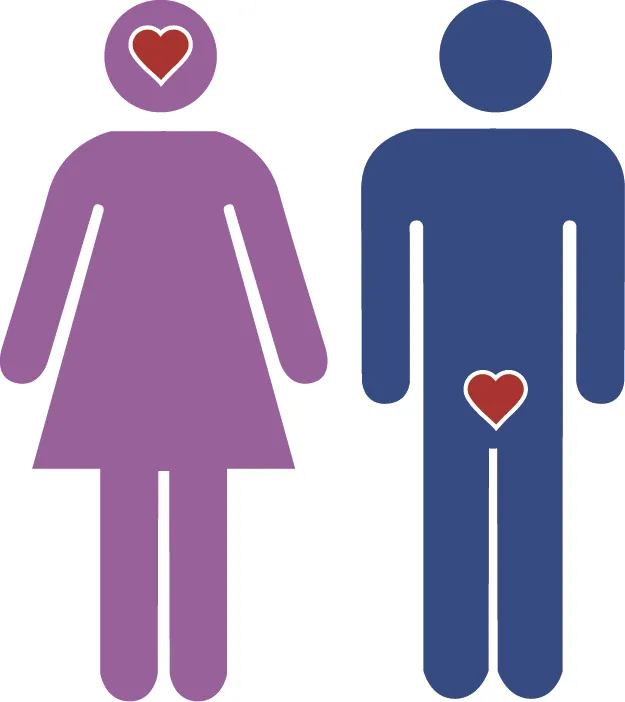 Este grafismo es sin duda divertido para las mujeres, no así para los hombres, que lo perciben como peyorativo, humillante. Pero si usted lo observa verá que, en el grafismo de la mujer, el corazoncito está ubicado en la cabeza y no en el corazón. Ninguno tiene el Amor en el lugar correcto. ¿Divertido no?