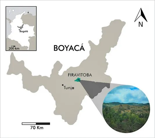 El Miembro Calcáreo de la Formación Tibasosa objeto de este estudio, geográficamente se localiza a 12 km del municipio de Sogamoso, en la Vereda Mombita Llano, del municipio de Firavitoba en el departamento de Boyacá (Figura 29).