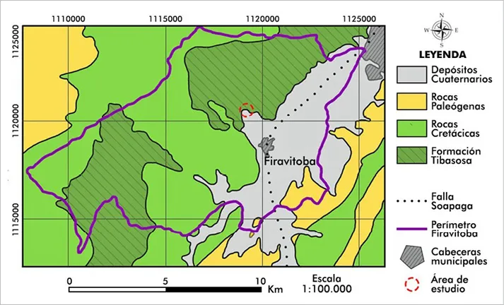 Geológicamente la zona se localiza al sur del macizo de Floresta en la Cuenca Sogamoso-Paz de Río; está constituida por rocas depositadas durante el periodo Cretácico Inferior-Paleógeno y depósitos cuaternarios principalmente de origen fluviolacustre (Velandia, 2003). Se identifican dos componentes geológicos de interés: la Formación Tibasosa y la Falla de Soapaga (Figura 30).