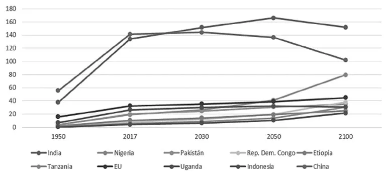 La población mundial ha tenido un crecimiento exponencial. En 1950 era de 2 500 millones y en 2017 llegamos a ser 7 500 millones (se triplicó en 67 años) y aunque la tasa de crecimiento ha disminuido se espera que en 2050 la población alcance 9 800 millones,2 es decir, en sólo 32 años se incrementará una cantidad de individuos adicionales equivalente a los que existían en 1950 (gráfica 1). Algunas proyecciones realizadas por la onu en 2017 indican que China (con 1 400 millones de habitantes) e India (1 300 millones de habitantes) siguen siendo los dos países más poblados, con 19% y 18% de la población mundial total. Para 2024, se espera que la población de India supere a la de China. Además, la mitad del crecimiento de la población mundial se concentrará en sólo nueve países: India, Nigeria, la República Democrática del Congo, Pakistán, Etiopía, la República Unida de Tanzania, los Estados Unidos de América, Uganda e Indonesia. Se prevé que la población de Nigeria, actualmente la séptima más grande del mundo, supere a la de Estados Unidos y se convierta en el tercer país más grande del mundo poco antes de 2050 (gráfica 2). Con el mismo modelo de desarrollo no será posible abastecer de alimentos, agua, aire limpio, energía y materias primas a toda esa población, con lo cual se agravará la pobreza, las desigualdades y los conflictos sociales.