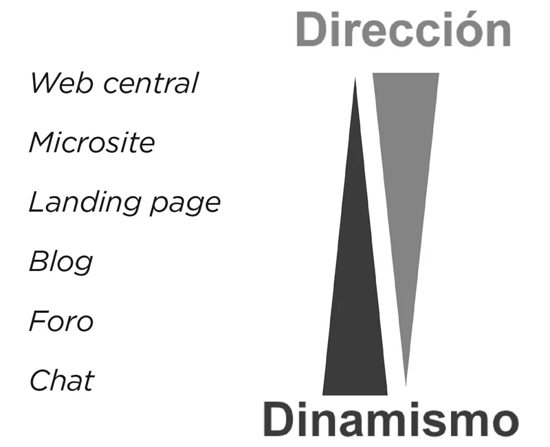 En un extremo, encontramos el sitio web central de la campaña que constituye el eje de la comunicación. Es unidireccional y nosotros decidimos qué contenidos se muestran, qué usuarios pueden participar y con qué reglas. Tenemos la potestad de seleccionar lo que nos interesa y despreciar aquello que no. Además, estos contenidos suelen ser de carácter más bien estático y no es necesaria una actualización permanente de los mismos. En el extremo contrario se sitúa el chat, donde todos los usuarios participan en la elaboración del contenido de un modo que solo tiene sentido en tiempo real y donde el dinamismo es absoluto.