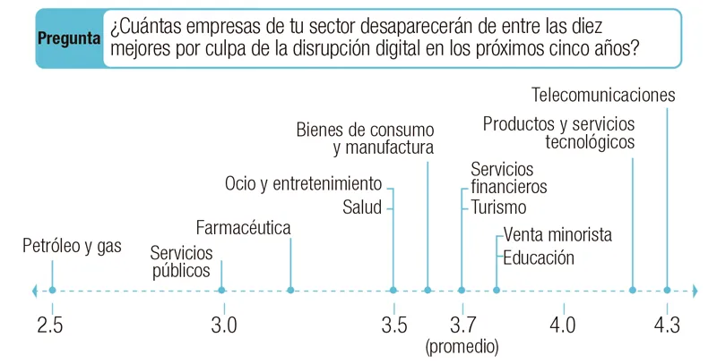 A partir de nuestro estudio hemos sacado conclusiones bastante preocupantes sobre la trascendencia que la disrupción tendrá para las empresas existentes del mercado y sobre su capacidad para adaptarse. Como mostramos en el cuadro 1.1, los directivos de nuestra encuesta creen que, de media, cuatro de las diez grandes empresas (por cuota de mercado) perderán su puesto durante los próximos cinco años a causa de la disrupción digital. Se prevé que las mayores pérdidas de puestos se darán en la industria de las telecomunicaciones (4.3) y las mínimas en la del petróleo y el gas (2.5). Pero el peligro va más allá de la «mera» pérdida de puestos de grandes compañías. Ahora se trata de la supervivencia de industrias enteras. Los directivos de los sectores que hemos estudiado creen que con la disrupción digital ha aumentado significativamente el riesgo de ser expulsado del mercado (cuadro 1.2).