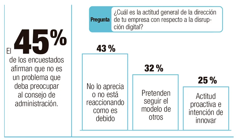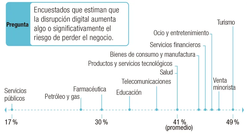 Pese a esta nefasta previsión, el 45 % de nuestros encuestados no consideran que la disrupción digital sea un problema que deba preocupar a su consejo de administración (cuadro 1.3). Y esta indiferencia existe incluso en sectores como el del turismo o las telecomunicaciones, que ya llevan más de diez años sometidos a las embestidas de la disrupción.