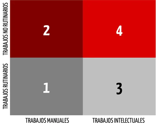 Uno de los problemas a los que posiblemente tengamos que enfrentarnos como sociedad es la polarización del mercado de trabajo. Entendemos que hay cuatro tipos de trabajo, y que cada uno de ellos va a tener distinta suerte en la etapa histórica que se está iniciando. Como es habitual, utilizamos una matriz de 2 x 2 mezclando dos variables relevantes para el caso. En esta ocasión, utilizaremos en las ordenadas: trabajos hechos básicamente con las manos o con la cabeza. Y en las abscisas: trabajos rutinarios o no rutinarios. Veamos el cruce en el cuadro 1.1 y hagamos algunas consideraciones de futuro.