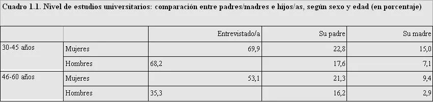 La mayor capacidad intelectual explica el acercamiento al modelo paternal, ya que inicialmente es quien más insiste en el desarrollo profesional de la hija. Los hombres de la generación entre 46 y 60 años presentan un nivel formativo bastante inferior que las mujeres de la misma franja de edad.