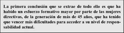 La distancia entre el nivel de titulaciones superiores de las directivas, en relación con los padres ha ido aumentado con el tiempo. A medida que se ha masificado en España el acceso a la educación superior, por una parte, se han incrementado las exigencias formativas para acceder a puestos de dirección. Por la otra, las mujeres de más de 45 años, que han llegado a la alta dirección, han debido realizar un esfuerzo formativo mucho mayor para acceder a estos puestos que los hombres de la misma generación. Para ellos, la formación universitaria ha sido menos decisiva para acceder a responsabilidades directivas.