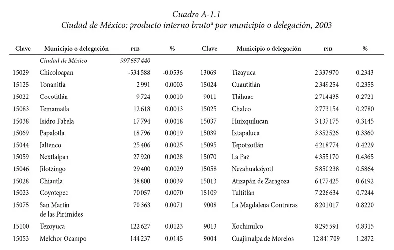 Como puede observarse en el cuadro A-1.1, muchas demarcaciones presentan una participación muy reducida del PIB en la ZMCM. Hay 21 municipios que no superan 0.1% de su participación, mientras que otros 12 están incluso por debajo de 0.01% de ésta. En contraste, tres delegaciones centrales concentran 55.81% de la actividad económica y sólo 16 alcanzan una participación superior a 1%. Por ello se plantea delimitar la zona de estudio como el Área Metropolitana de la Ciudad de México (AMCM) donde la actividad económica sea más intensa y garantizar la existencia de los datos por AGEB.