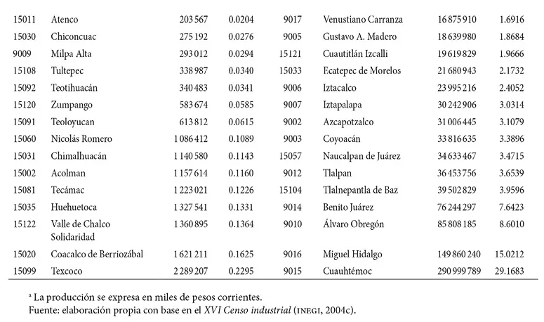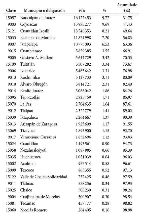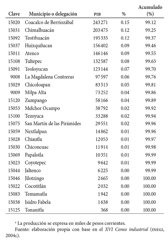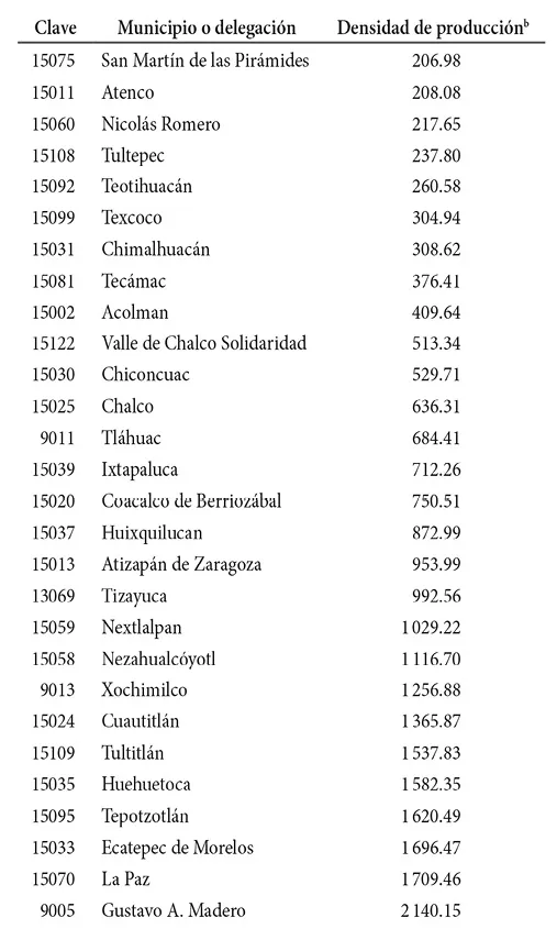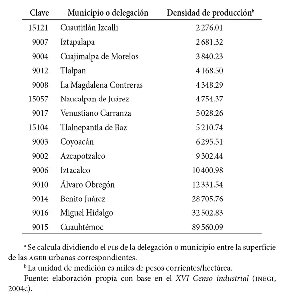 Al comparar los datos de ambos cuadros, se advierte que no existen diferencias sustanciales en cuanto a la importancia de las demarcaciones por concentración de la actividad económica. Solamente destacan los casos de la delegación La Magdalena Contreras y del municipio de La Paz, los cuales mejoran su ranking al considerar la densidad de producción.