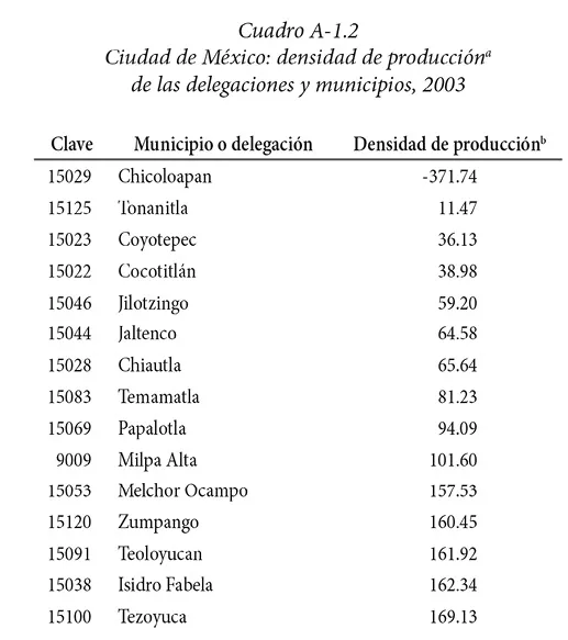 Estos datos ciertamente muestran las demarcaciones con mayor importancia en cuanto a la actividad económica, pero es necesario considerar que se están comparando delegaciones y municipios cuya superficie y extensión urbana son diferentes, de ahí que se realice la comparación con densidad de producción[2] con el propósito de ofrecer un panorama real de las zonas con aparentemente baja actividad económica, pero como en áreas urbanas pequeñas. Los resultados se muestran en el cuadro A-1.2.