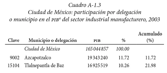 Como se puede observar en el cuadro A-1.3, la concentración de la actividad industrial es menor que la de toda la actividad económica. Mientras que tres delegaciones concentran más de 50% de la actividad económica, seis demarcaciones acaparan la mayoría de la actividad industrial. Sin embargo en la parte inferior de la tabla se advierte un comportamiento similar en cuanto a la baja participación de numerosos municipios en la actividad manufacturera, pues hay 36 municipios cuya participación es inferior a 1%, e incluso seis con una participación menor que 0.01 por ciento.