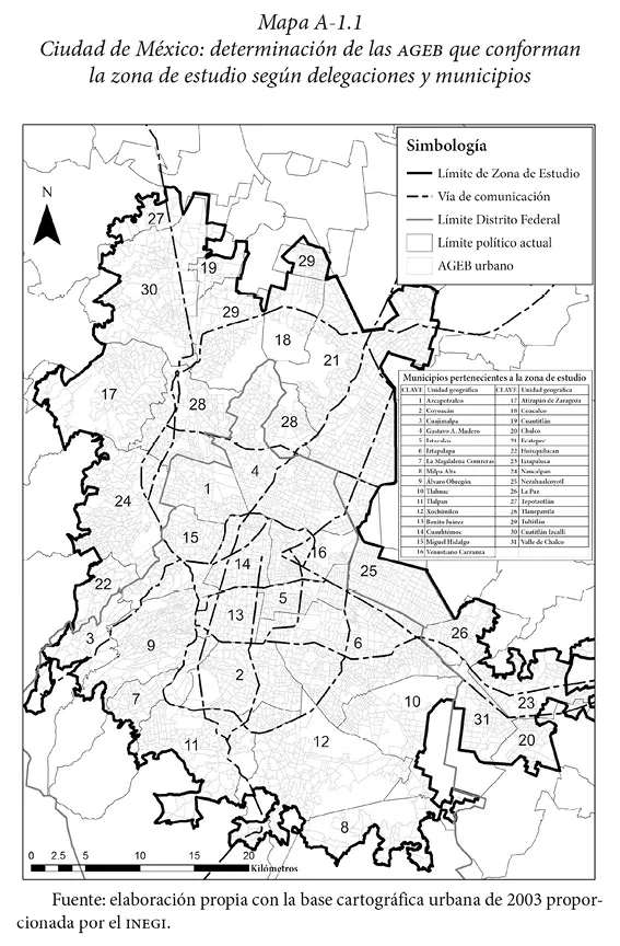 En relación con los mapas que se muestran, se aclara que para definir la zona de estudio se adoptó una serie de criterios. Primeramente debe existir continuidad urbana, así como evitar que existan huecos o zonas dentro del área de estudio. Segundo, que el contorno de la zona de estudio sea lo más regular posible buscando una forma compacta. Tercero, es necesario considerar solamente a las AGEB de los municipios y las delegaciones pertenecientes a la AMCM, ya que no todas las A...
