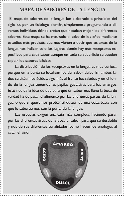 La mayoría de las especias tienen sabores «especiales», genuinos, únicos; que tienen poco o nada que ver con el sabor original del alimento que condimentamos. Se ha dicho que el aprecio por ellas desde épocas muy antiguas es debido a que enmascaraban los sabores (por ejemplo, de podrido o fermentado) de los alimentos deficientemente conservados; o que son plantas medicinales que estimulan el apetito. Ambas cosas son correctas, y entre muchas otras, las intentaremos explicar en este libro.