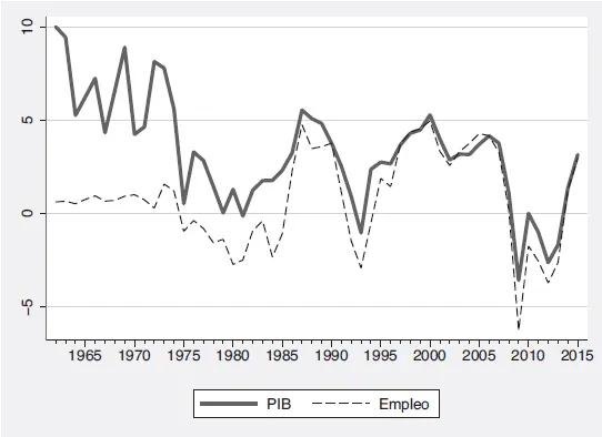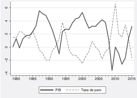 El gráfico 1.1 representa las tasas anuales de crecimiento del PIB y del empleo en la economía española desde 1962. Esta información estadística procede de la base de datos Economic Outlook, de la Organización para la Cooperación y el Desarrollo Económicos (OCDE), la cual permite realizar comparaciones internacionales de ambas variables con series temporales largas. El empleo se refiere al número de ocupados, sin tener en cuenta variaciones de las horas de trabajo por trabajador. El gráfico 1.2 se refiere a la relación entre el crecimiento del PIB y la variación de la tasa de paro, aunque solo desde 1979, cuando su medición por las estadísticas nacionales empezó a ser algo más solvente.3