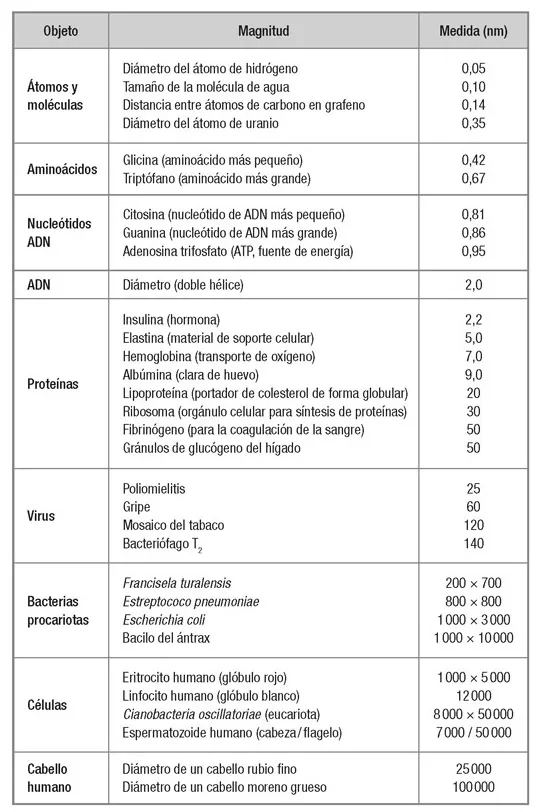 Al hombre siempre le ha subyugado la idea de intervenir en los procesos involucrados en la vida para curar enfermedades, aumentar la calidad de vida y alargarla en lo posible. Un objetivo fundamental de la biología y la medicina es entender cuáles son los mecanismos de ingeniería molecular, responsables últimos de la vida. Conocerlos y actuar sobre ellos se traducirá necesariamente en el diagnóstico y posterior cura de enfermedades. Piénsese por ejemplo en el diagnóstico genético y las terapias génicas, basadas en la detección y corrección de anomalías en el ADN. La nanotecnología está llamada a tener un papel estelar en estas tareas; si se observa detenidamente el contenido de la tabla de la página contigua, se constatará que los fundamentos de la vida se encuentran en la escala nanométrica. La integración de la nanotecnología con la biología trae como consecuencia el nacimiento de la nanobiotecnología, con diversas variantes, como la nanomedicina.