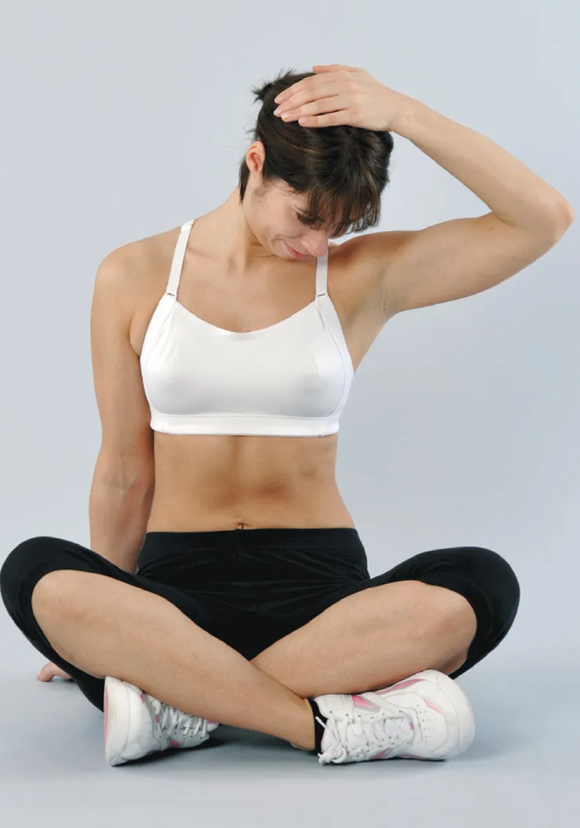 Nos sentamos con la espalda bien recta. Colocamos la mano derecha debajo del muslo derecho, giramos la cabeza 45˚ a la izquierda y flexionamos el cuello. Manteniendo los hombros horizontales, apoyamos la palma de la mano izquierda en la parte posterior de la cabeza. Al espirar, dejamos que el peso del brazo aumente suavemente la flexión. Continuamos respirando profundamente, hasta obtener el máximo alargamiento.