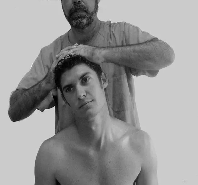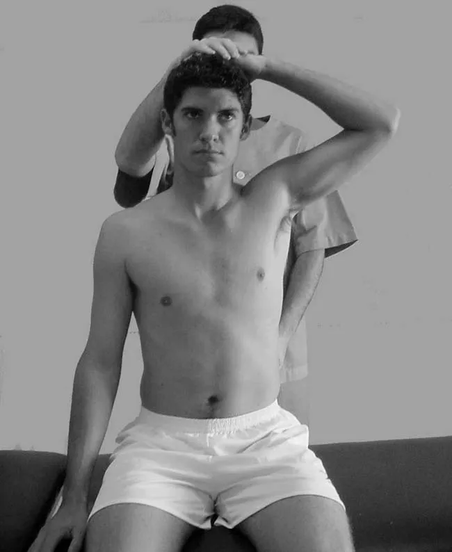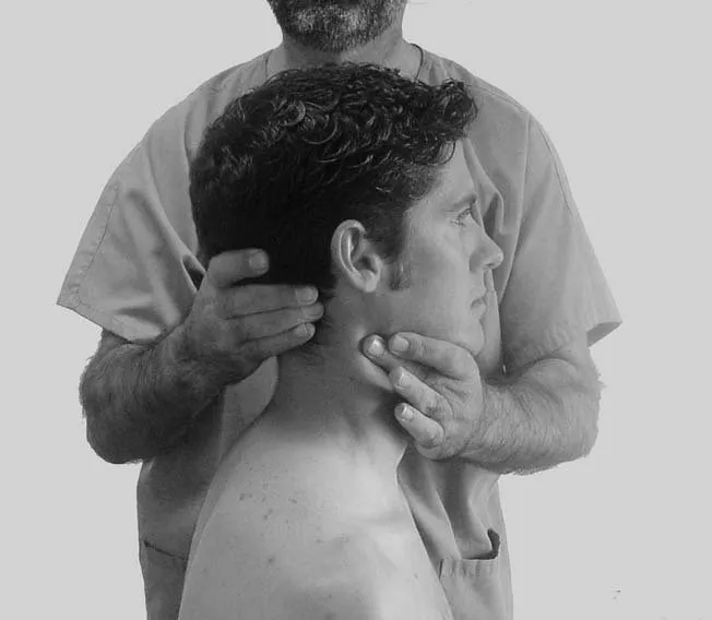 Posición del examinador: De pie, en la vertical del hombro afecto, el cual estará a la altura del tronco. Una mano bajo la mandíbula del paciente y la otra bajo el occipital, en la base del cráneo.