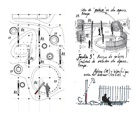 Mi idea era un parque para adultos. Un lugar exterior urbano, sencillo y realista. Con sus bancos de lectura donde detenerse a reposar en los ratos robados a la oficina. La novedad principal era que contenía un bosque de relojes de arena, de escala humana, que al girarlos te concedían un tiempo de abstracción.
