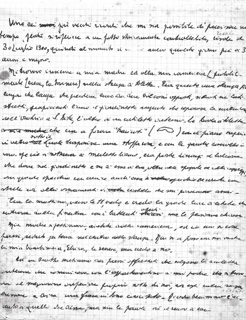 Otro recuerdo que puedo identificar bien es el del terremoto de Mesina (28 de diciembre de 1908). El temblor se sintió muy bien en Palermo, pero no lo recuerdo; creo que no interrumpió mi sueño. Sin embargo, «veo» claramente la gran péndola inglesa de mi abuelo, que entonces, incoherentemente, estaba en el salón de invierno: la «veo» parada en la hora fatal de las cinco y veinte, y oigo a uno de mis tíos (creo que era Ferdinando, que tenía locura por la relojería) que me explica que se había parado por el terremoto de la noche anterior. Además, recuerdo que al anochecer, hacia las siete y media, estaba en el comedor de mis abuelos (muchas veces asistía a su cena, porque la mía era más tarde) cuando uno de mis tíos, probablemente el mismo Ferdinando, entró con un periódico de la tarde que decía «Graves daños y numerosas víctimas por el terremoto de esta mañana en Mesina».