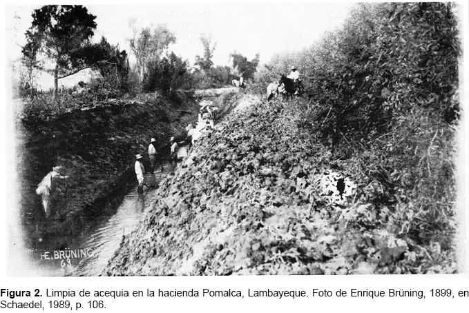 Si bien, al parecer, las modificaciones territoriales se realizaron con herramientas relativamente sencillas, habrían comprometido una tecnología vasta y compleja caracterizada por el despliegue y la articulación de conocimientos y de formas de organización social de la producción. Las herramientas más comunes, documentadas arqueológicamente, posiblemente asociadas a este tipo de modificaciones territoriales —excavación de canales, movimientos de tierra, construcción de muros de contención y diques para bocatomas, entre otras obras de infraestructura— son sobre todo utensilios elementales, desde modestos palos cavadores hasta palas de madera labrada. También se registra el uso de telas crudas o costales para acarrear tierra, arena o material suelto, sin olvidar el fundamental empleo de la fuerza física corporal. Este último para, por ejemplo, levantar muros de mampuesto, es decir, aquellos construidos con piedras sin labrar que se colocan con las manos, si bien a veces las dimensiones pueden implicar el auxilio de palancas, cuerdas u otros aparejos5. En resumen, queremos llamar a no confundir la posible simpleza o rudimento de estos utensilios o herramientas, con la complejidad mayor que representan las modificaciones territoriales concebidas como instrumentos de producción de escala territorial (figura 2).