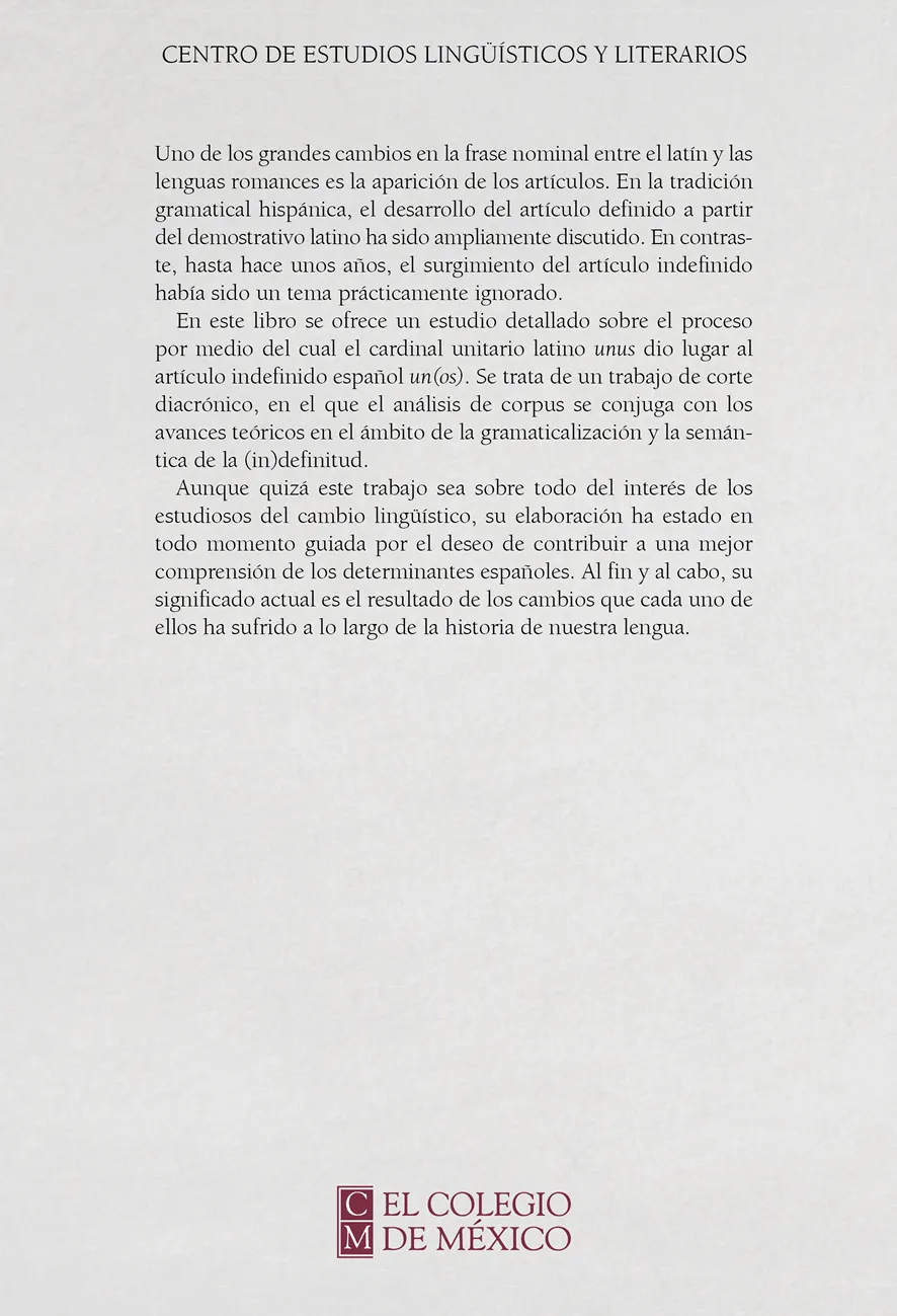 Uno de los grandes cambios en la frase nominal entre el latín y las lenguas romances es la aparición de los artículos. En la tradición gramatical hispánica, el desarrollo del artículo definido a partir del demostrativo latino ha sido ampliamente discutido. En contraste, hasta hace unos años, el surgimiento del artículo indefinido había sido un tema prácticamente ignorado.En este libro se ofrece un estudio detallado sobre el proceso por medio del cual el cardinal unitario latino unus dio lugar al artículo indefinido español un(os). Se trata de un trabajo de corte diacrónico, en el que el análisis de corpus se conjuga con los avances teóricos en el ámbito de la gramaticalización y la semántica de la (in)definitud.