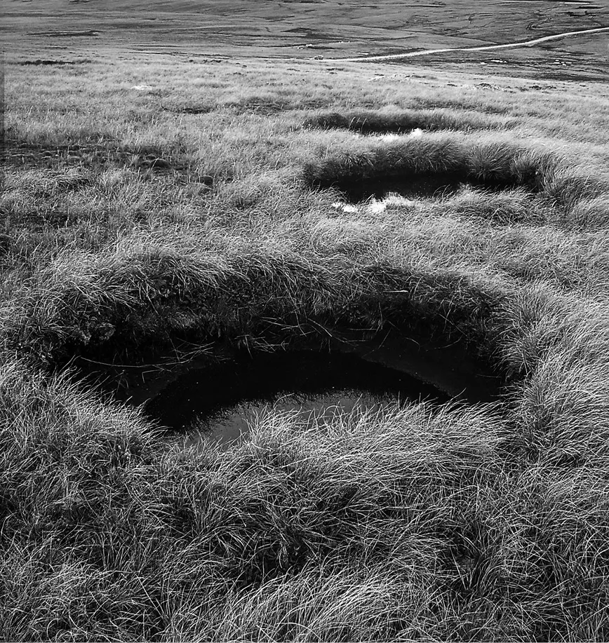 Vista de las marcas de la artillería británica desde las antiguas posiciones argentinas en el Wireless Ridge al atardecer