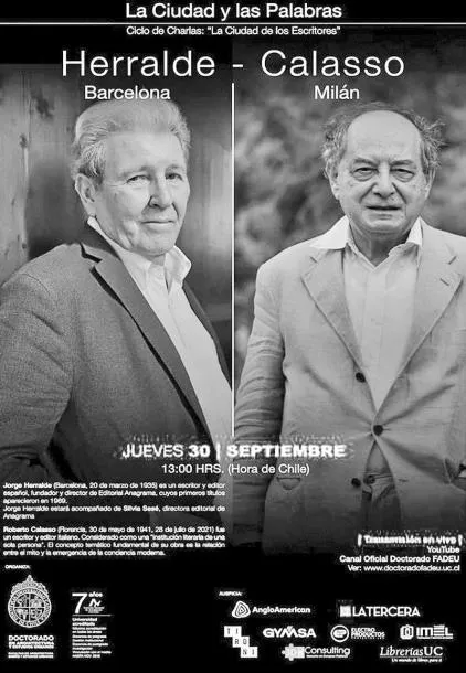Cartel de la intervención online de Jorge Herralde en el ciclo La Ciudad y las Palabras, Barcelona-Chile, 30 de septiembre de 2021.